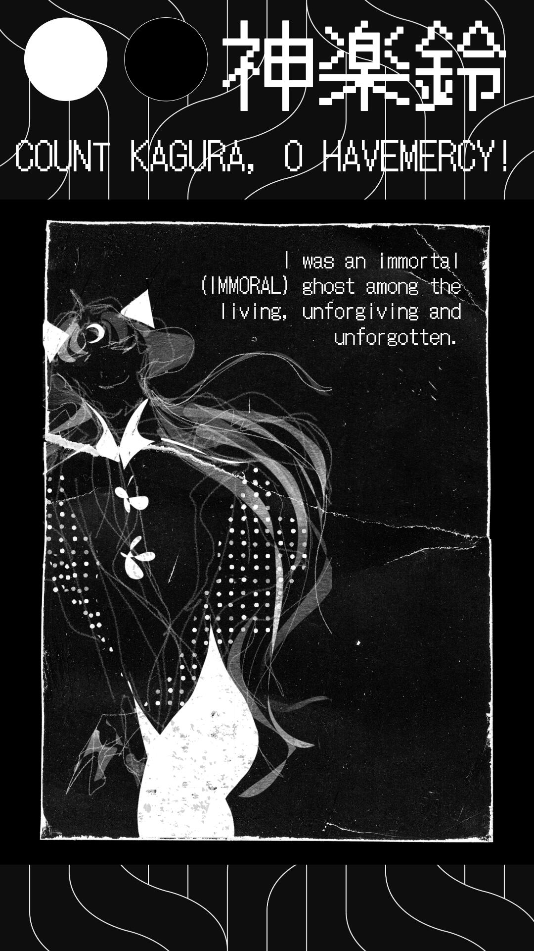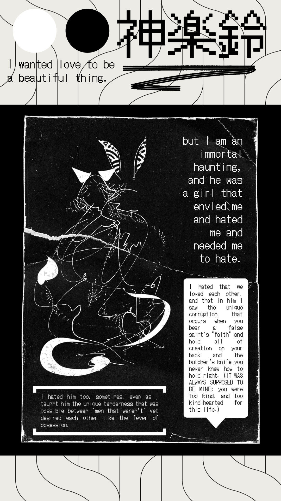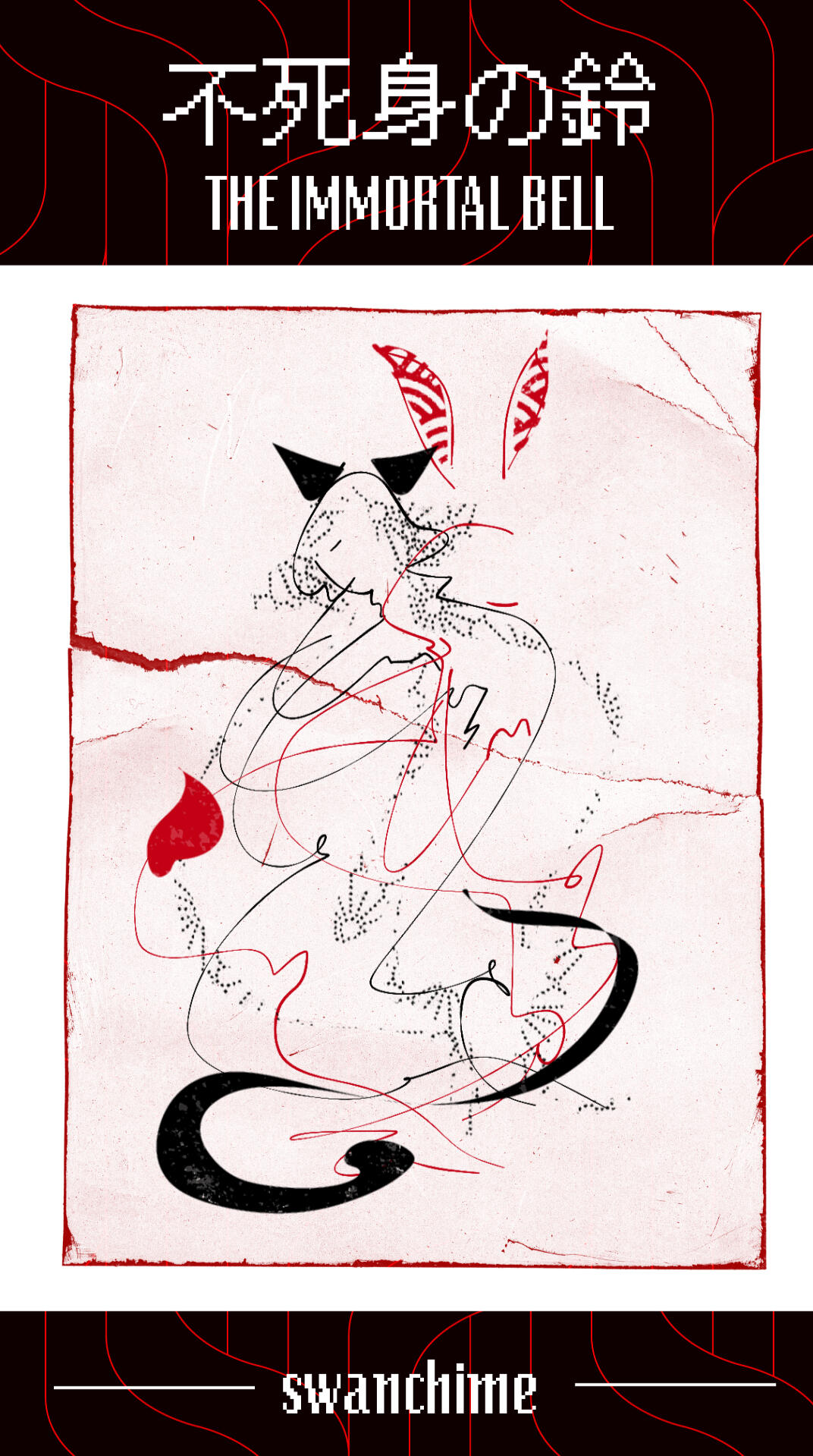 THE IMMORTAL BELL is about the unfortunate red thread of fate that the titular immortal, kagurasuzu (suzu meaning round bell, like on a ceremonial kagurasuzu bell wand or a cat's collar) plays with fate like a length of red yarn.this is his glass coffin of every tenderness and regret.