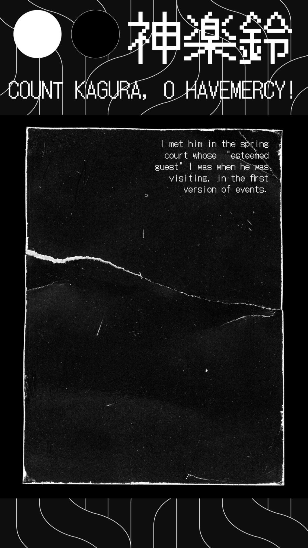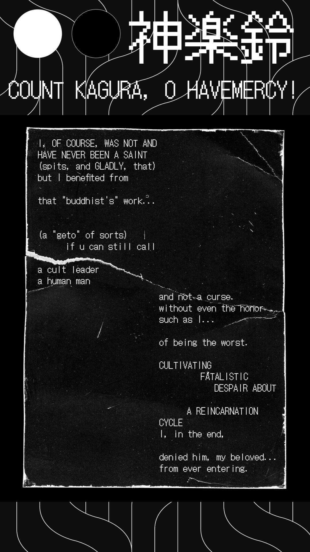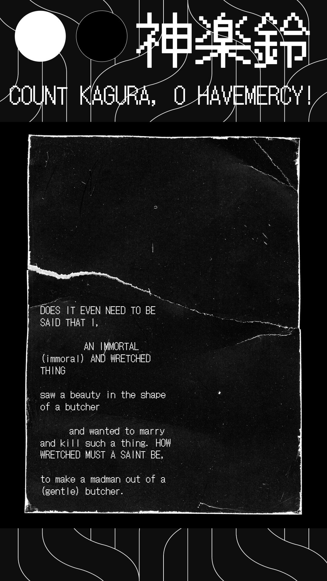THE IMMORTAL BELL is about the unfortunate red thread of fate that the titular immortal, kagurasuzu (suzu meaning round bell, like on a ceremonial kagurasuzu bell wand or a cat's collar) plays with fate like a length of red yarn.this is his glass coffin of every tenderness and regret.
